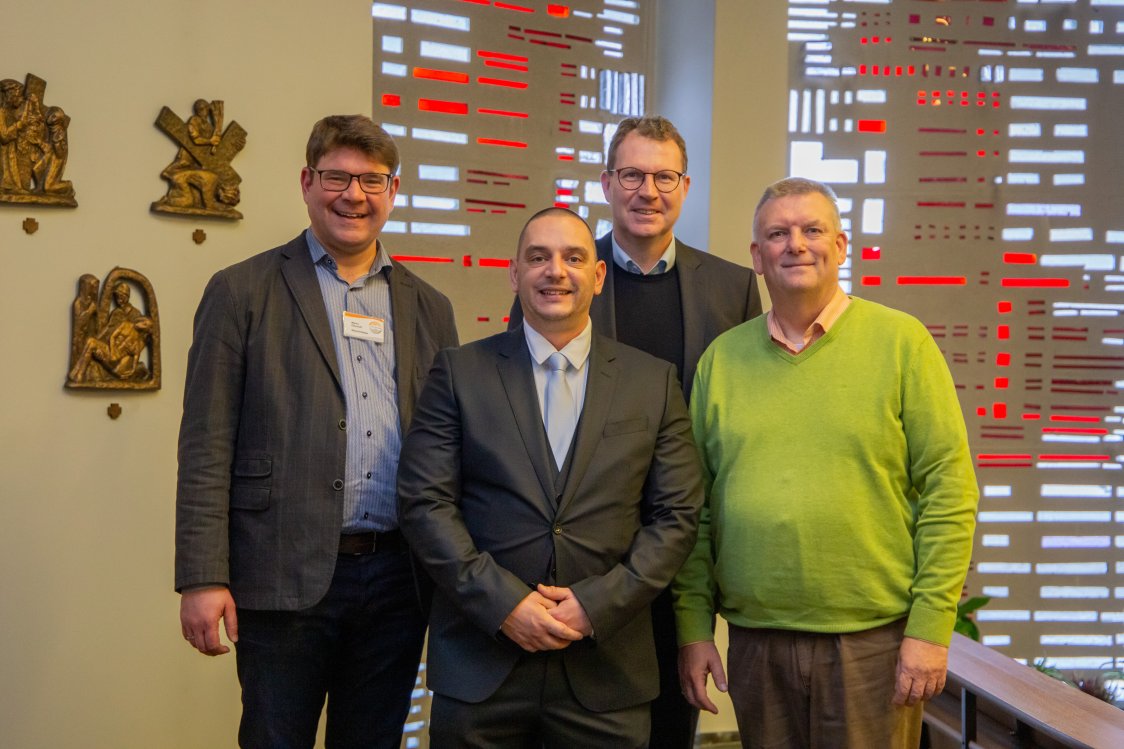 Sie begrüßen den neuen Chefarzt für Neurologie am St. Josef Hospital der KHWE in Bad Driburg (von links): Standortleiter Marko Ellerhoff, Dr. Djordje Stojkovic, Verwaltungsratsvorsitzender Marcel Giefers und KHWE-Geschäftsführer Christian Jostes.